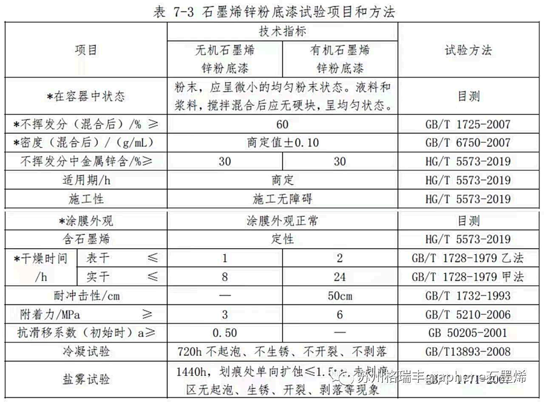 中國船級社為滿足風力發(fā)電場設(shè)施防護涂料產(chǎn)品認證需求,修訂《涂料產(chǎn)品認證實施專用規(guī)則》TR08057,考慮到國家大力支持的石墨烯涂料應(yīng)用的可能性,首次將石墨烯鋅粉防腐涂料也納入認證范圍。其中要求,不揮發(fā)分中金屬鋅含≥ 30%,冷凝試驗,720h, 不起泡,不生銹,不開裂,不剝落。